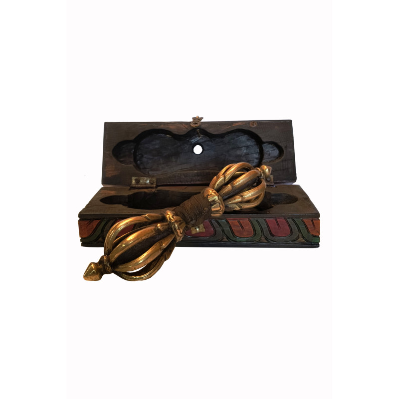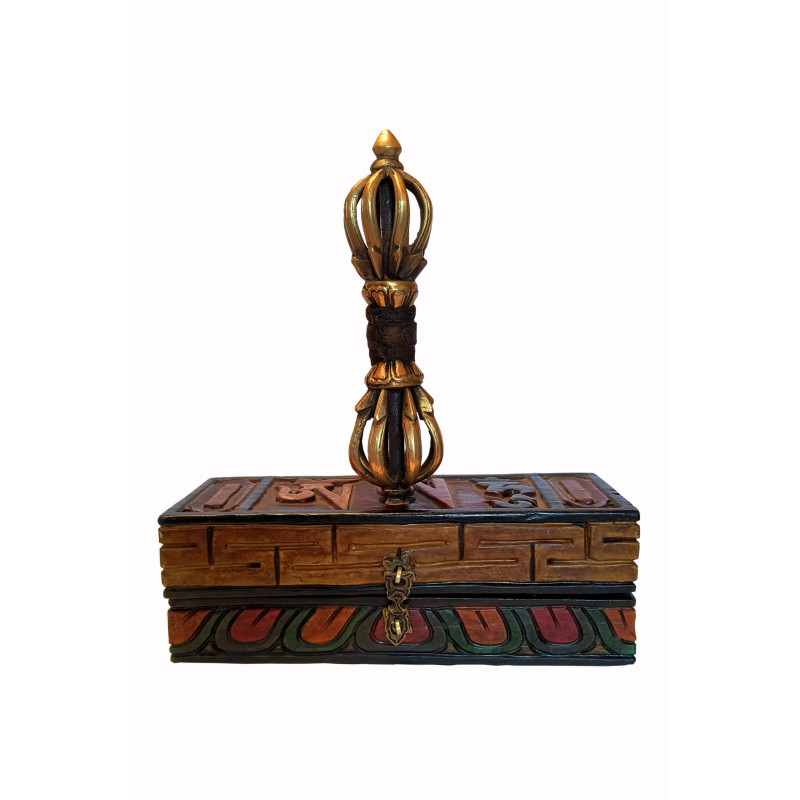 Dorje con caja de madera tallada . El dorje en el budismo y Vajra en el hinduismo, es el símbolo de Vajrayana. Rayo o diamante que destruye todo tipo de ignorancia, y en sí mismo es indestructible. El Vajra simboliza el principio masculino que representa el método en la mano derecha . La interacción conduce a la iluminación.