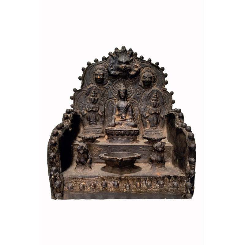 Altar tibetano de madera, terracota y tela con estatua de Buda, Avalokiteshvara y Chhepu.